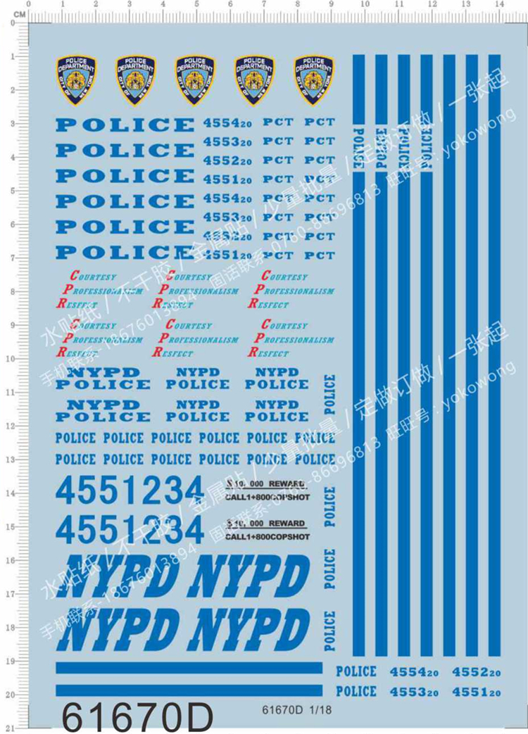 1 x 1/18 Scale NYPD Police Water Slide Decal for Car Model Kits 61670D
