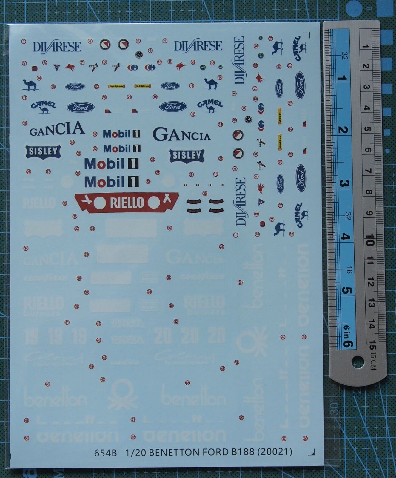 1 x 1/20 Scale Decals for BENETTON FORD B188 F1 Car Model 654B