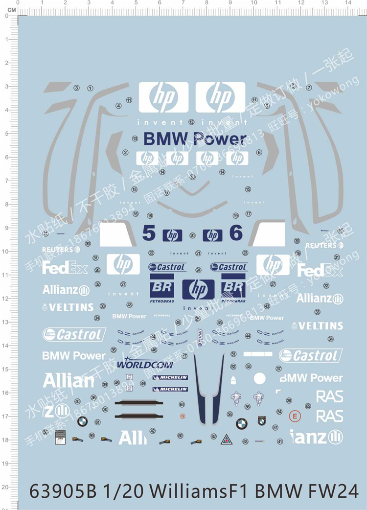 1 x 1/20 Scale Decals for Williams F1 BMW FW24 Car Model Kits 63905B