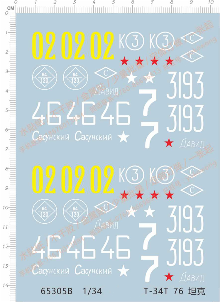 1 x 1/35 Scale WWII Soviet Union T-34 T-76 Tank Model Decal 65305B