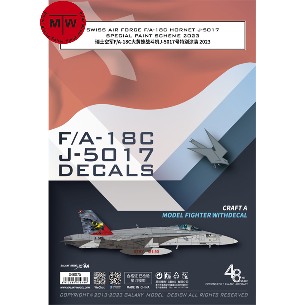 1 x 1/48 Scale Swiss Air Force F/A-18C Hornet J-5017 Special Paint 2023 Decals for Aircraft Model Kit G48075