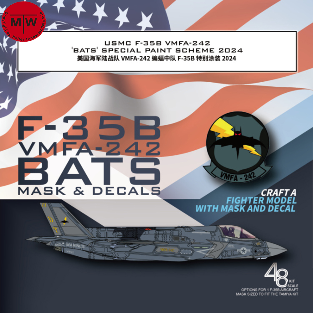 1 x 1/48 Scale USMC F-35B VMFA-242 BATS 2024 Flexible Mask & Decal for Tamiya 61125 Model Kit G48094