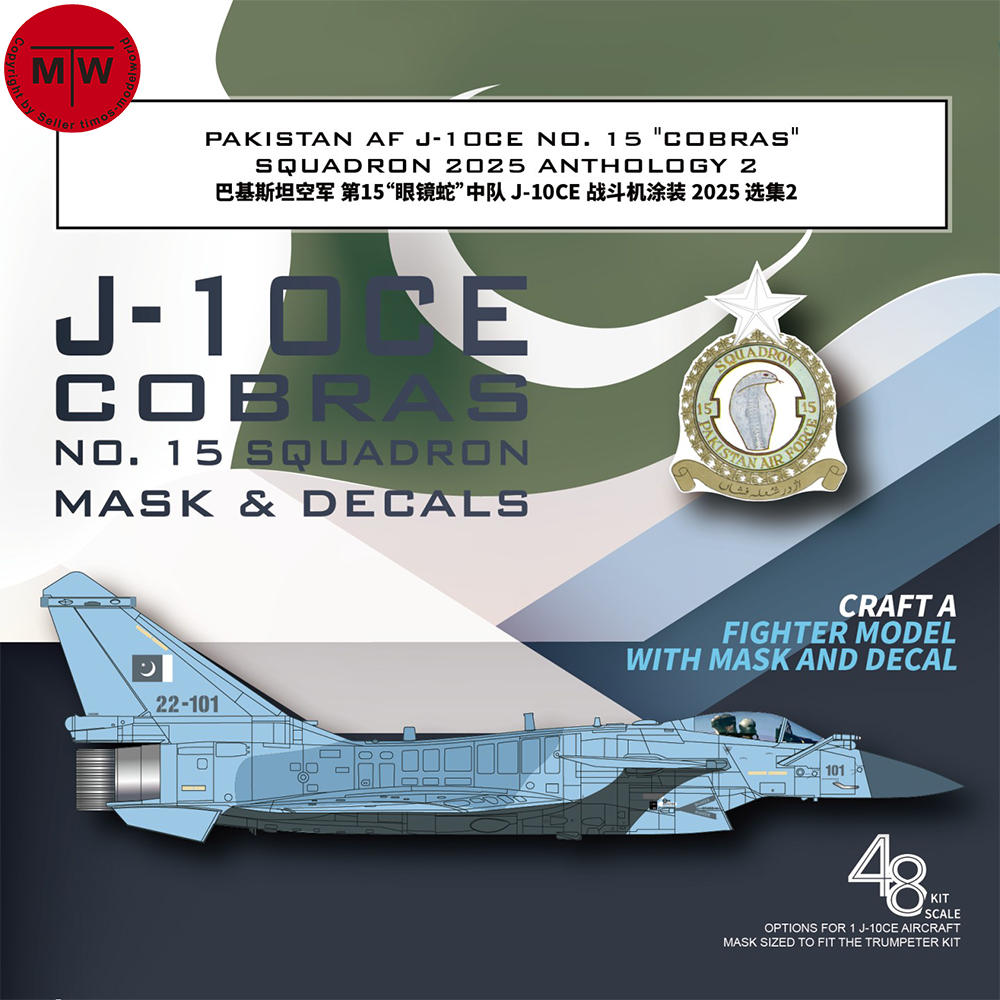 1 x 1/48 Scale Pakistan AF J-10CE Cobras NO.15 Squadron 2025 Mask & Decals for Trumpeter 05826 Model Kit G48103 or G48104